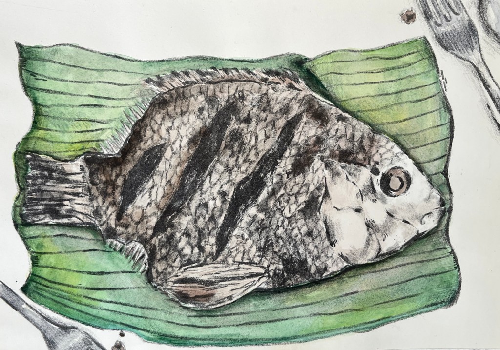 Tilapia, 5.5.” x 8.5″, 2024, Lithography, Watercolor paint